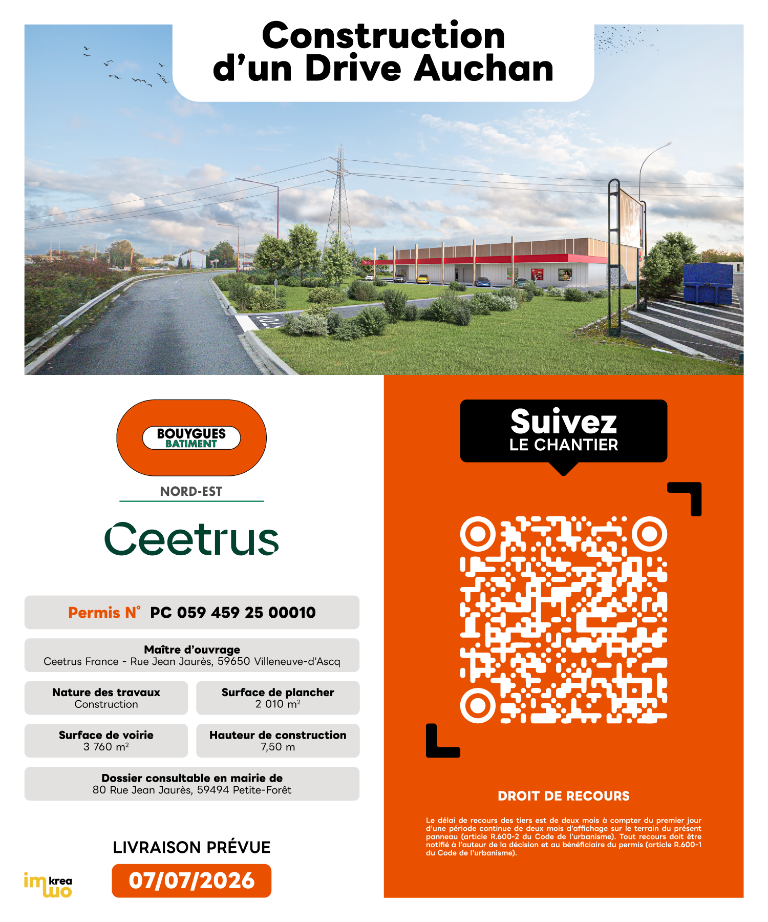 Le projet prévoit la construction d’un drive pour l’enseigne Auchan à Petite-Forêt afin de faciliter le retrait rapide des courses commandées en ligne. Situé à proximité des axes principaux et de la zone commerciale, cet équipement offrira plusieurs pistes de retrait et des espaces logistiques dédiés, tout en s’intégrant dans son environnement et en renforçant l’offre de services de proximité.